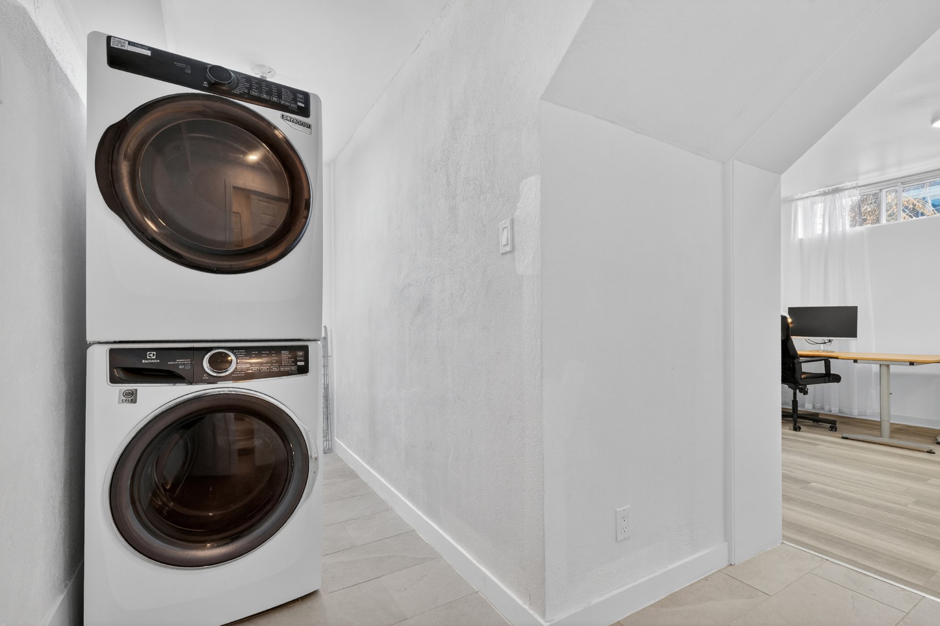 | Certains panneaux de rideaux blancs (articles de mise en scène). Les panneaux de rideaux d'origine seront laissés aux acheteurs. Cuisinière dans la cuisine du rez-de-chaussée. Laveuse et sécheuse. | |
