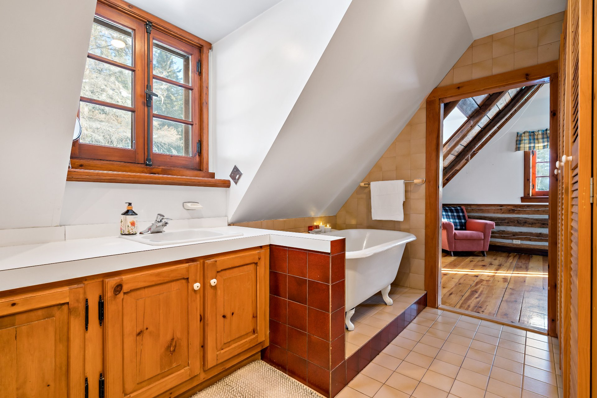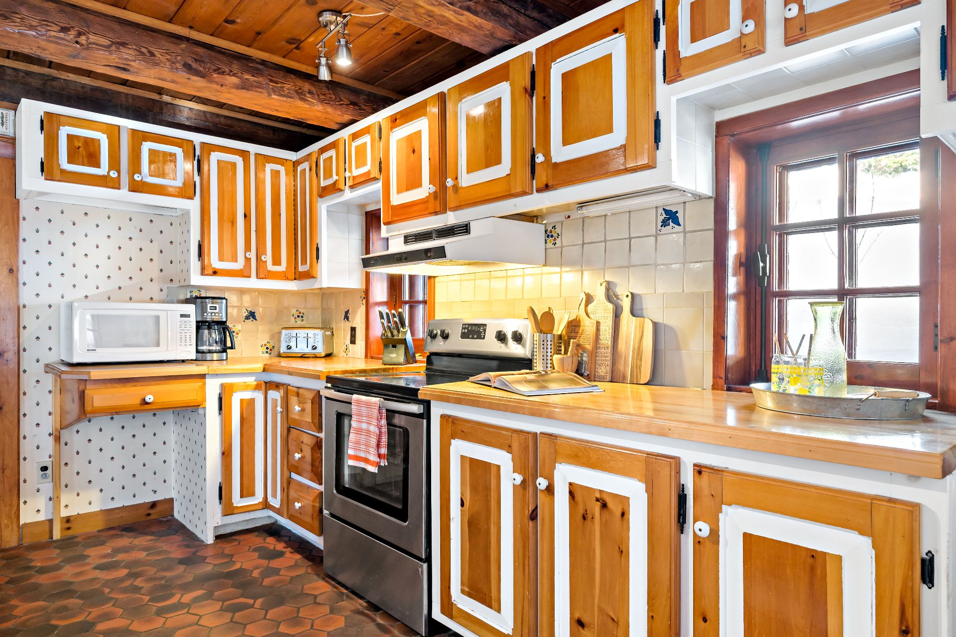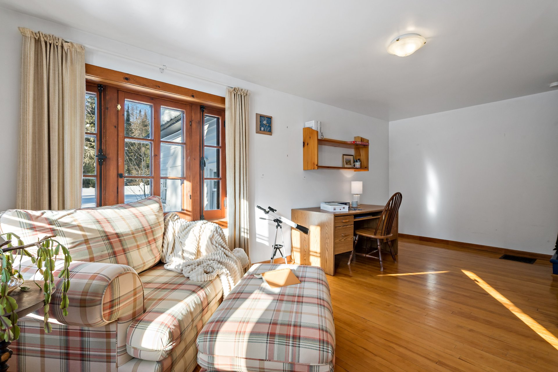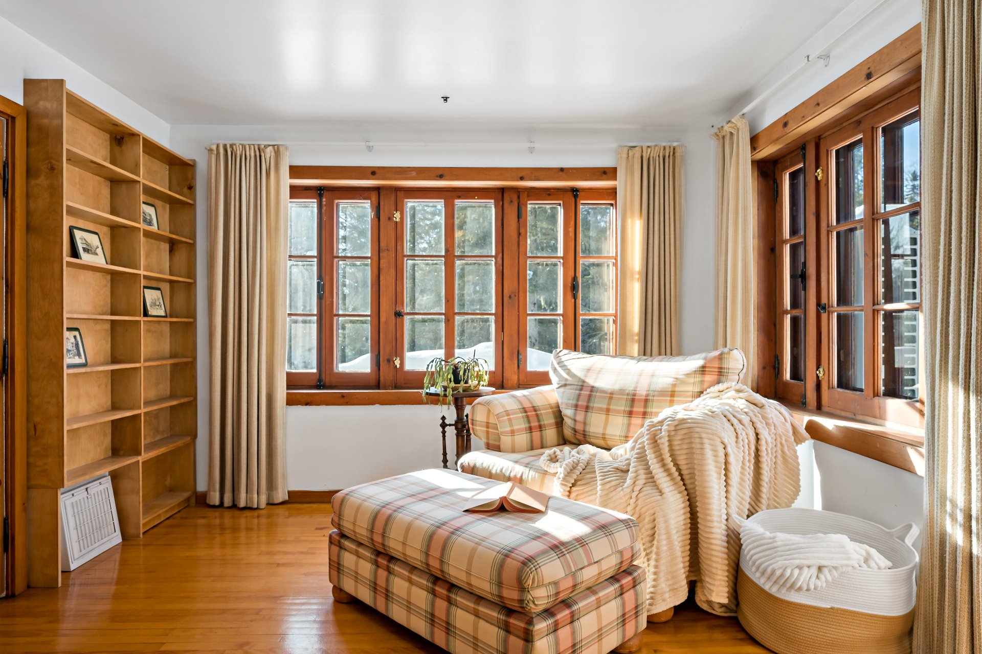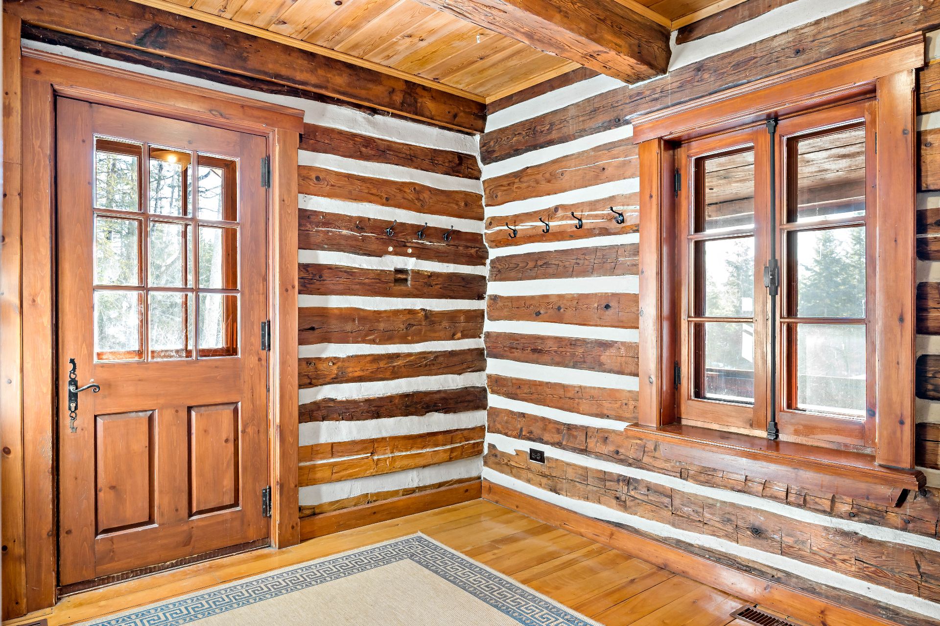 boiseries chaleureuses et fenêtres à crémones. Une