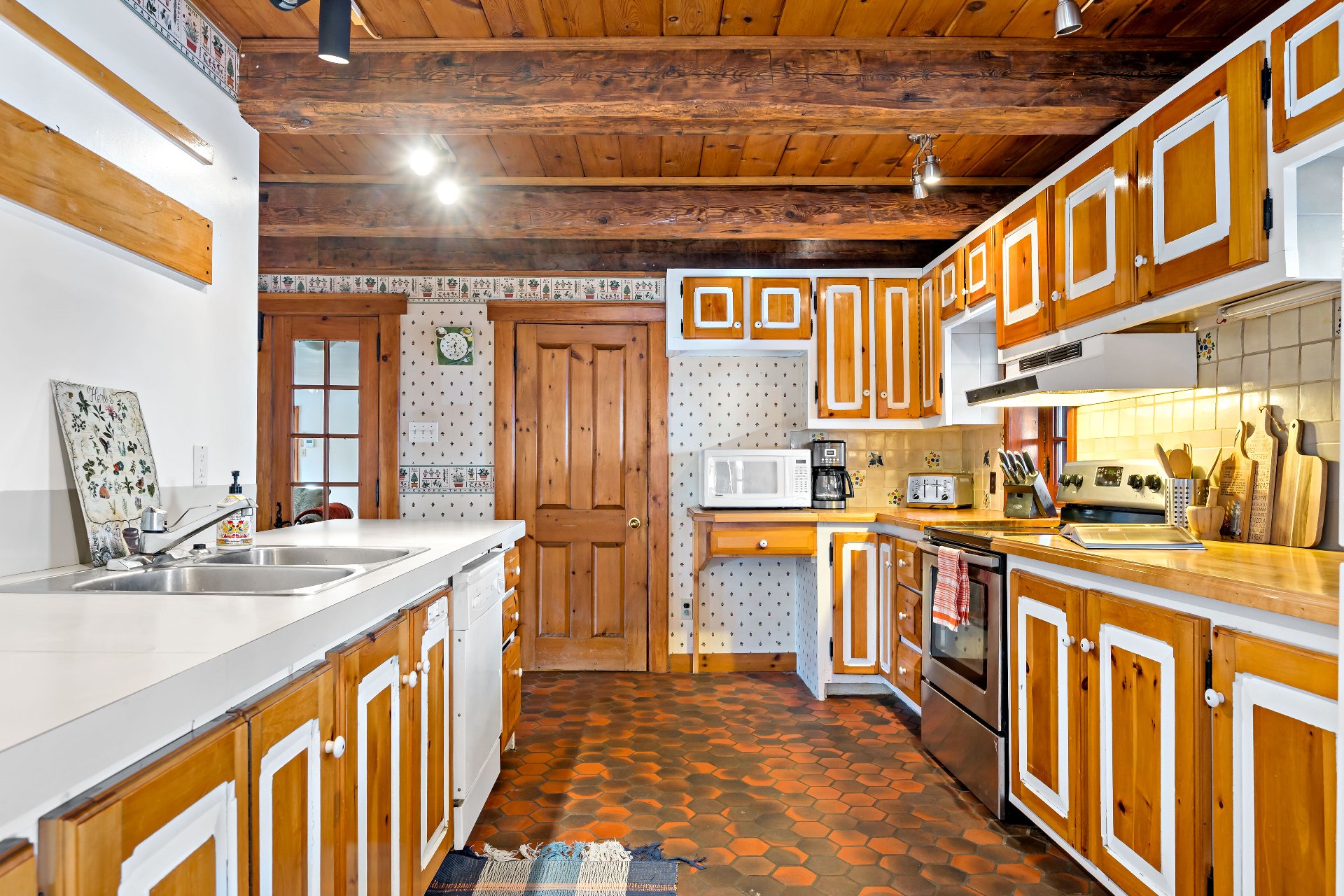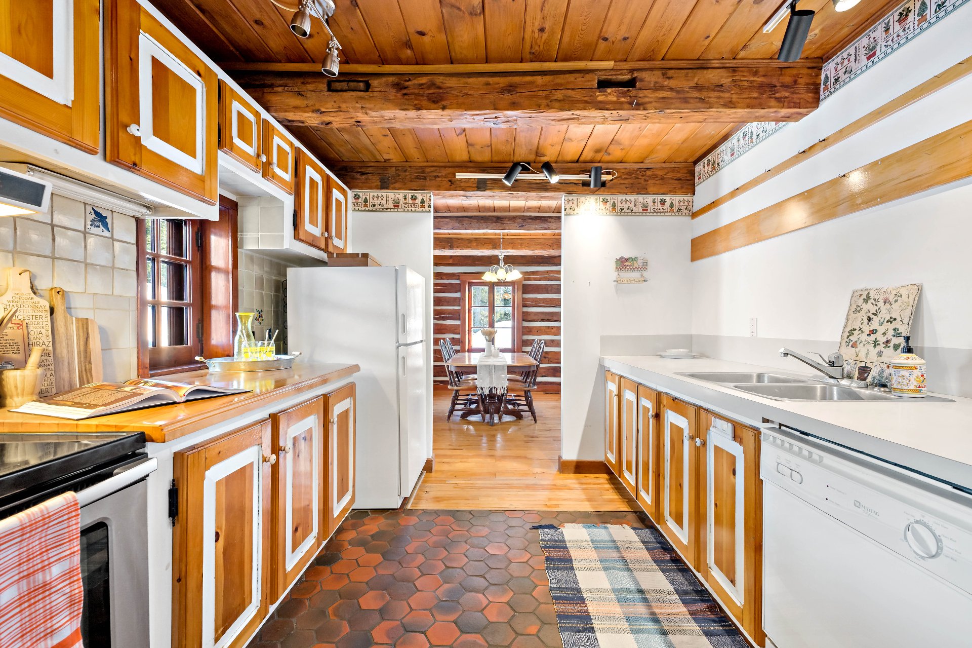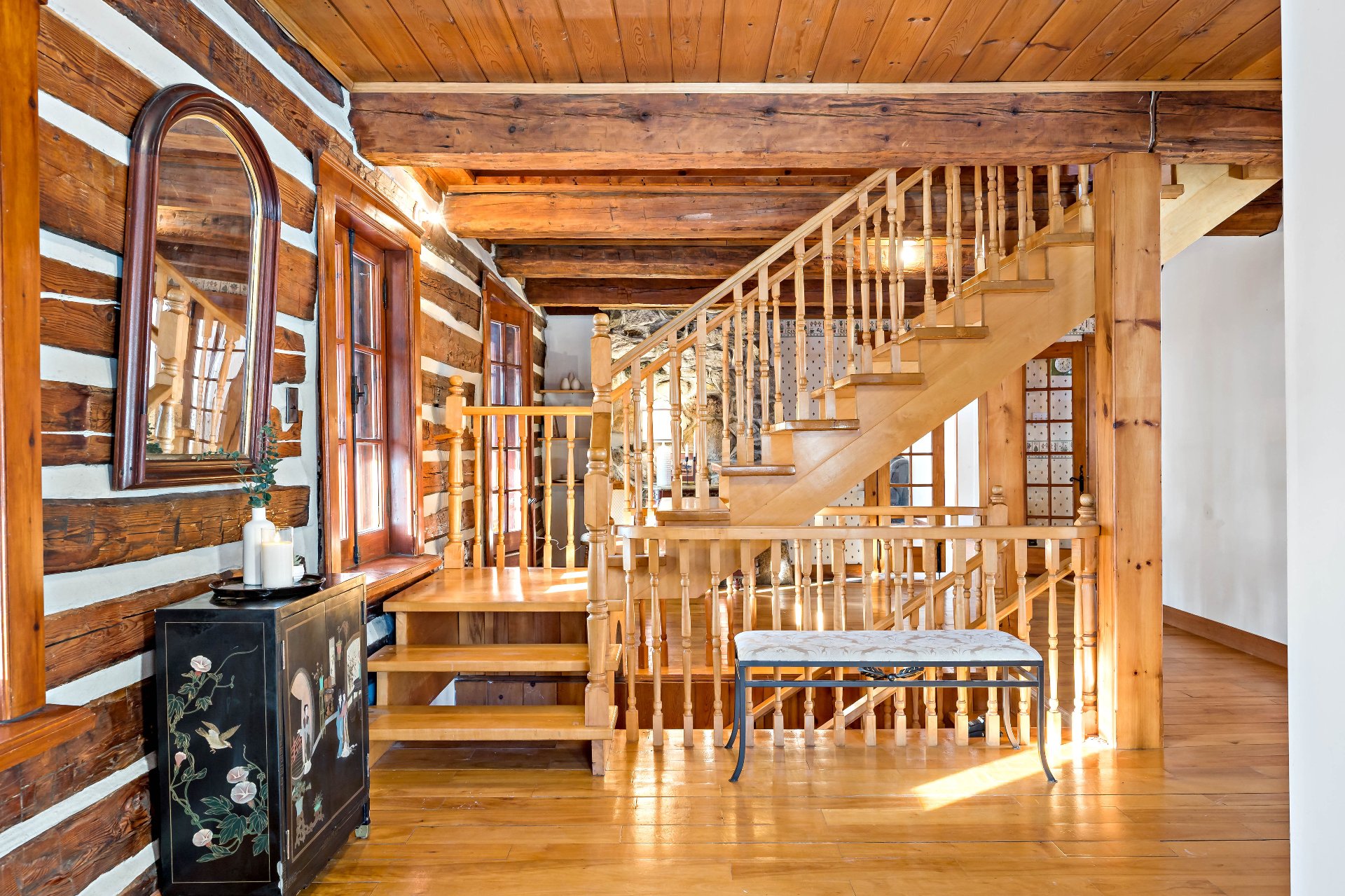 bois rustiques à larges lames, poutres apparentes,