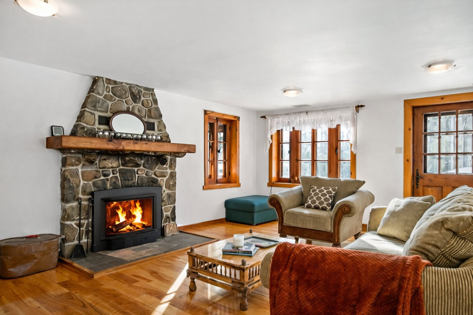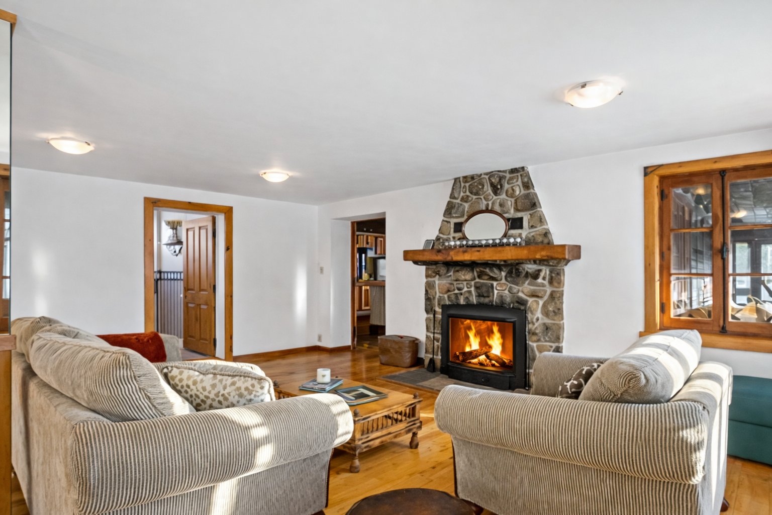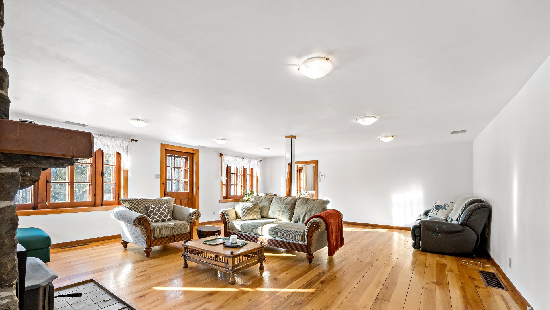 imposante cheminée en pierre ancre le vaste espace de vie,