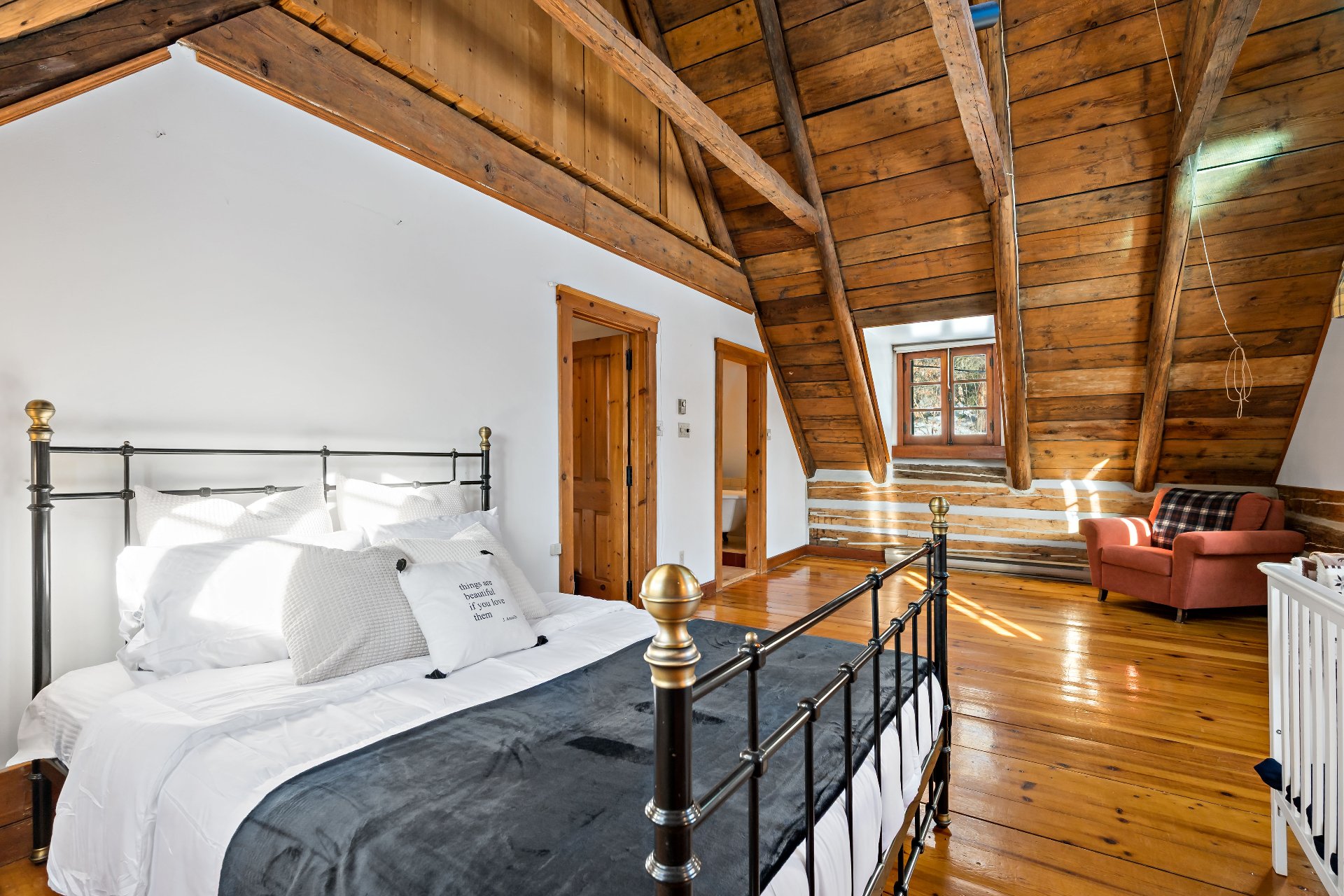 Domaine ancestral emblématique début du 20e siècle sur plus de 26 acres, avec trois étangs privés, un réseau de sentiers et aucun voisin arrière. Lumineuse et pleine de caractère, la résidence en madriers carrés équarris à la main offre 5+1 chambres, fenêtres à battants avec crémones, riche boiserie, plafonds voûtés, poutres apparentes, planchers rustiques à larges lattes et majestueuse cheminée de pierre. Intimité, envergure et potentiel exceptionnel pour refuge familial, projet d'écotourisme, auberge ou gîte. Doit être acheté avec le lot adjacent de 108 acres (lot 6 028 585: 459 000 $). Acheteur responsable des vérifications. Voir addenda.